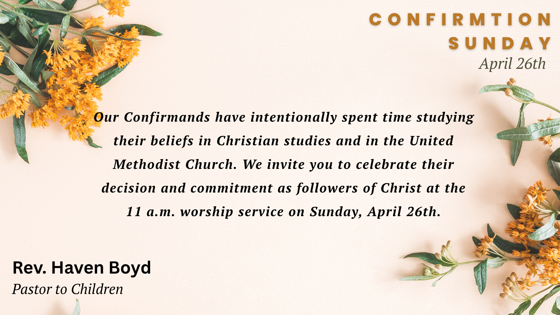 Our Confirmands have intentionally spent time studying their beliefs in Christian studies and in the United Methodist Church. We invite you to celebrate their decision and commitment as followers of Christ at the 11 a.m. worship service on Sunday, April 26th.