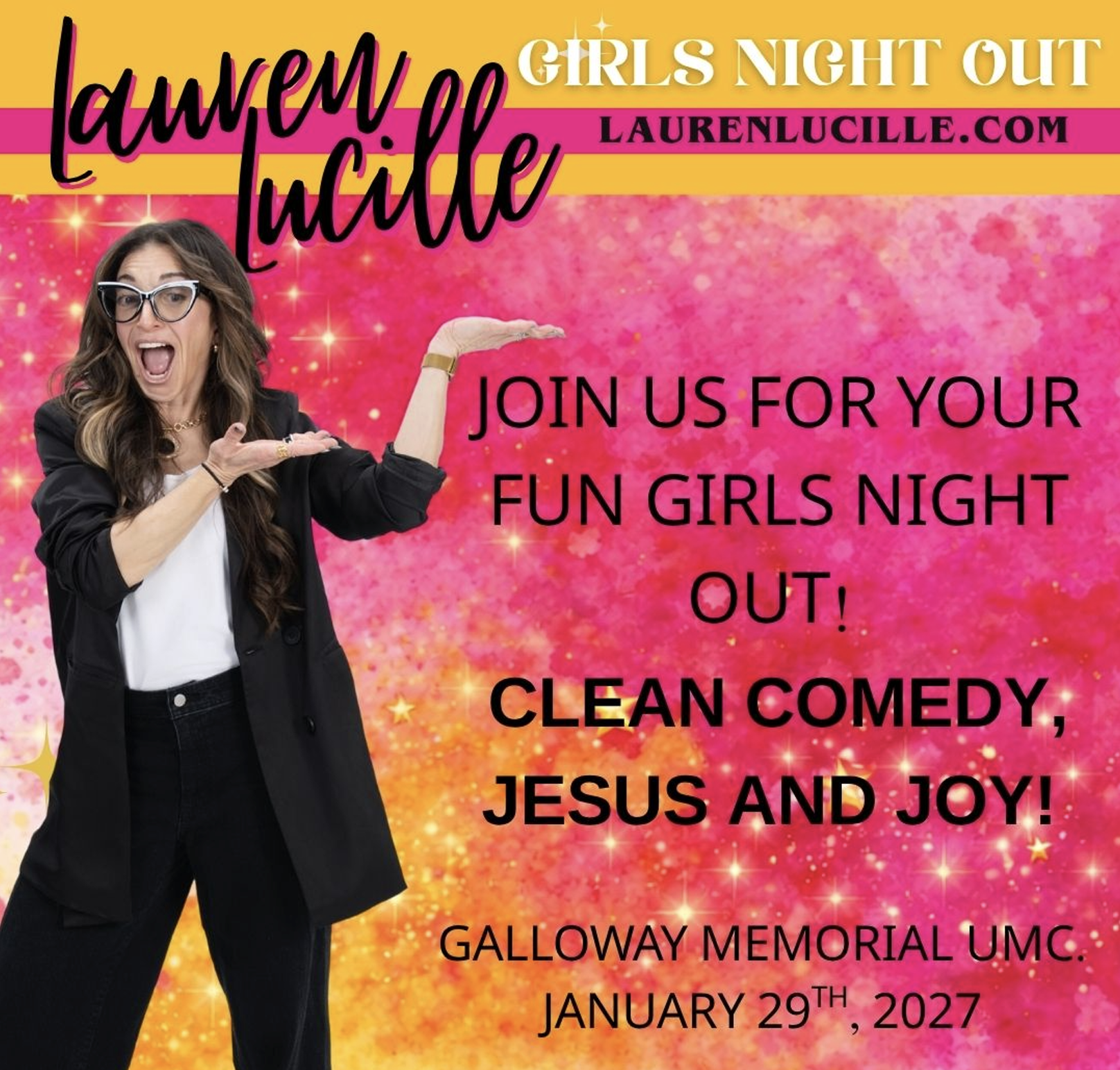 Grab all your friends and join us for a FUN girls’ night out of clean comedy, Jesus and Joy! This clean comedy night, with comedian Lauren Lucille, will leave you lighter than when you walked in!