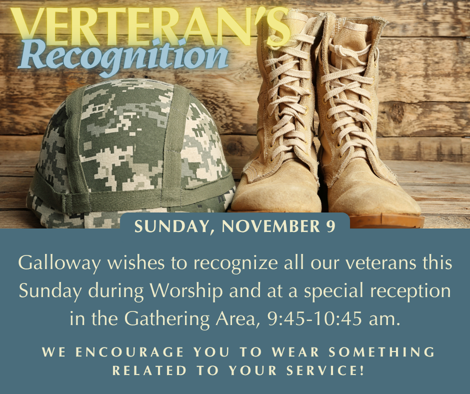 Galloway aims to honor all veterans this Sunday during both our 8:30 and 11:00 am worship services, with a reception taking place in the Gathering Area from 9:45 to 10:45 am.