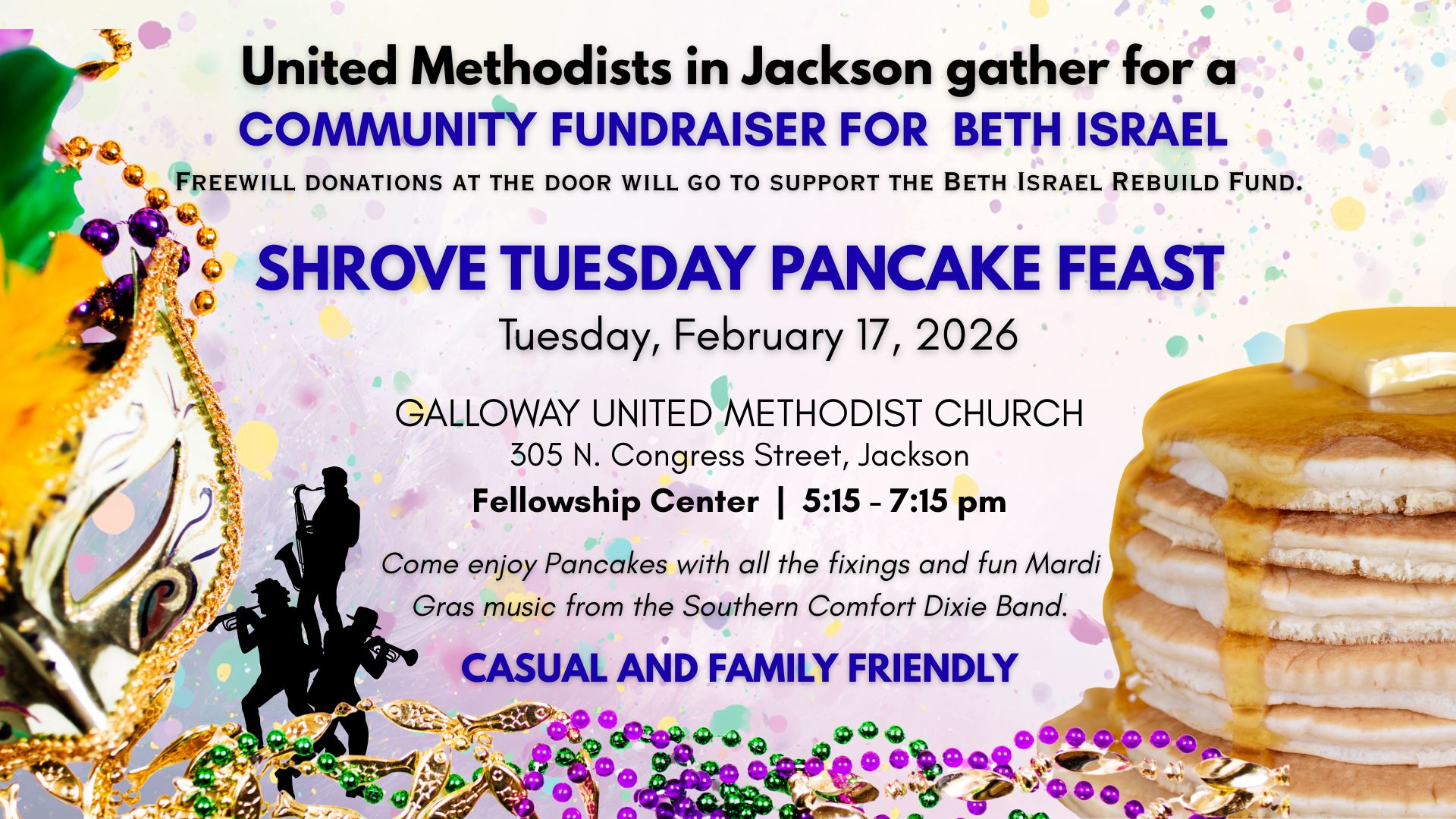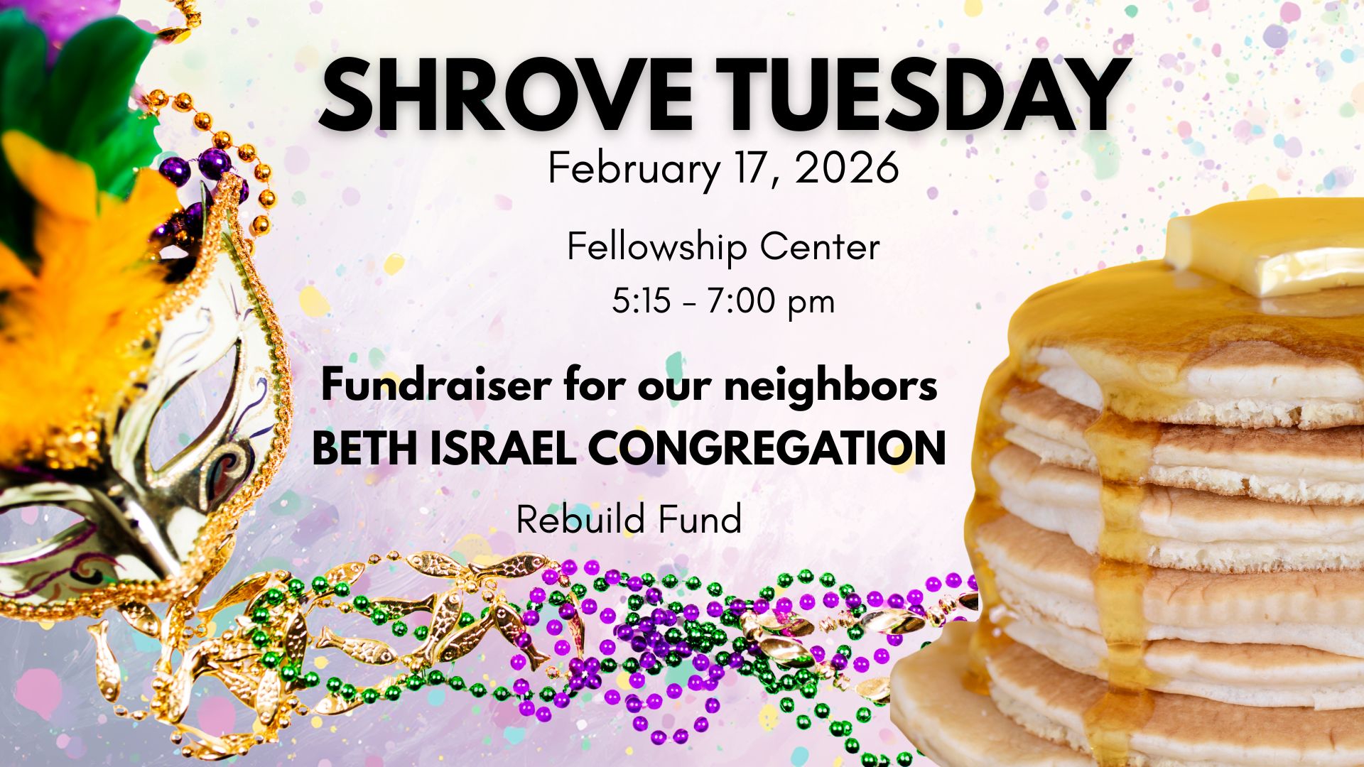 Join us for Shrove Tuesday for a community gathering and enjoy pancakes with all the fixings. This will also be a Fundraiser for our neighbors - BETH ISRAEL CONGREGATION, Rebuild Fund. Watch for more details on how you can be a part of this evening. |
