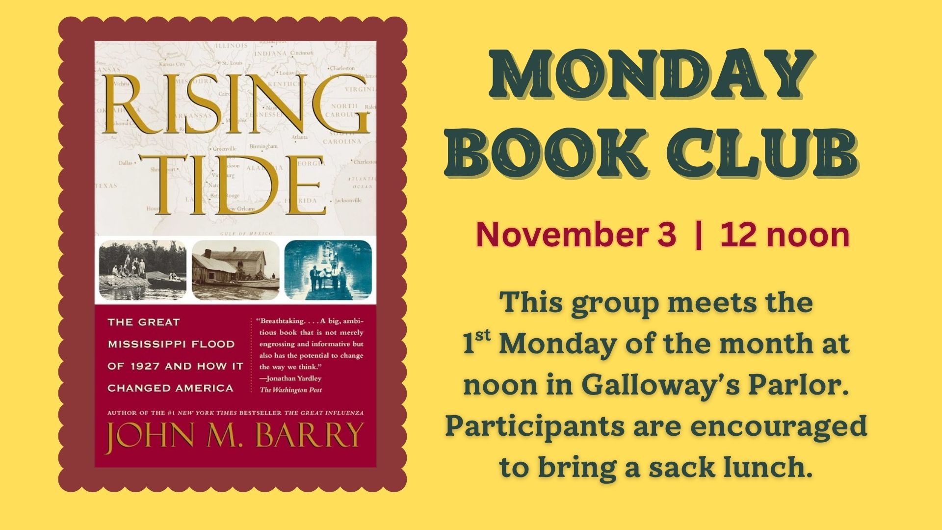 All are invited to join the Monday Book Club, which meets on the first Monday of each month at noon in Galloway's Parlor.